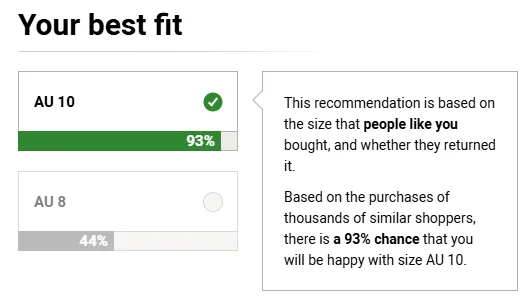 Once you’ve filled in your details, Fit Finder uses real data from other shoppers — what they bought, what they kept, and what they returned — to give you the best size suggestion. Often, it will recommend two sizes, so you can choose the one that feels right for you.